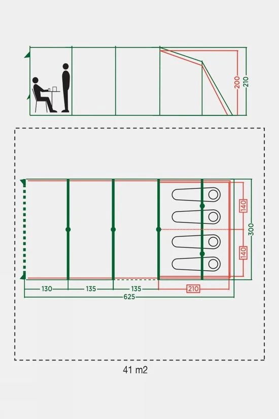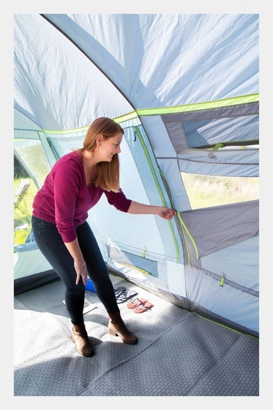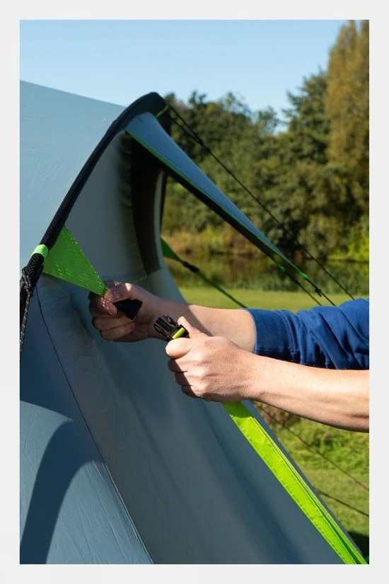 This large family tent is ideal for weekends away as well as longer breaks. The tent has an extended open front porch area offering additional living space with protection from the elements. The front porch can be closed off for additional weather protection with an easily attached zipped front face. Fibreglass poles support the tent structure and ensure both a lighter weight package as well as flexibility to deflect stronger wind gusts while the fitted storm straps offer greater peace of mind in higher winds. The tent benefits from good head height throughout and several large windows provide plenty of light. The two bedrooms are extra large and will comfortably fit larger airbeds and feature BlackOut Bedroom technology blocking daylight, reducing the temperature during the day and increasing it at night, ensuring a more restful sleep for all the family. The windows also feature zipped window shades ensuring flexible levels of privacy and the main entrance has a drop down doorway providing barrier-free access reducing possible trip hazards. Additional features include zipped cable entry points allowing access for powered accessories together multiple lantern attachment points. Ample ventilation is provided at the side and rear of the tent via a full width aperture to reduce condensation.