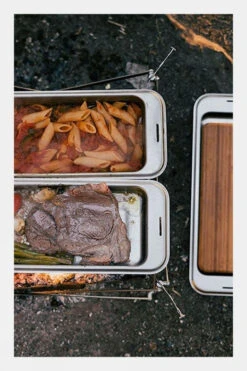 This 9-piece cooking multi-kit is designed for use with the Wolf and Grizzly grill to cook directly over the campfire. The cooking equipment is made of 304 Stainless Steel, ensuring safety of use, even at high temperatures, and will age beautifully over time. The chopping board is made from bamboo, an earth-friendly material that is durable and resistant to bacteria. All components nest within the 2L Pot for ultimate portability. Cook Set comes with a drawstring storage bag that efficiently houses your entire kit and keeps the rest of your gear clean. The bag is made from recycled nylon and the microfiber cloth is made from polyester.